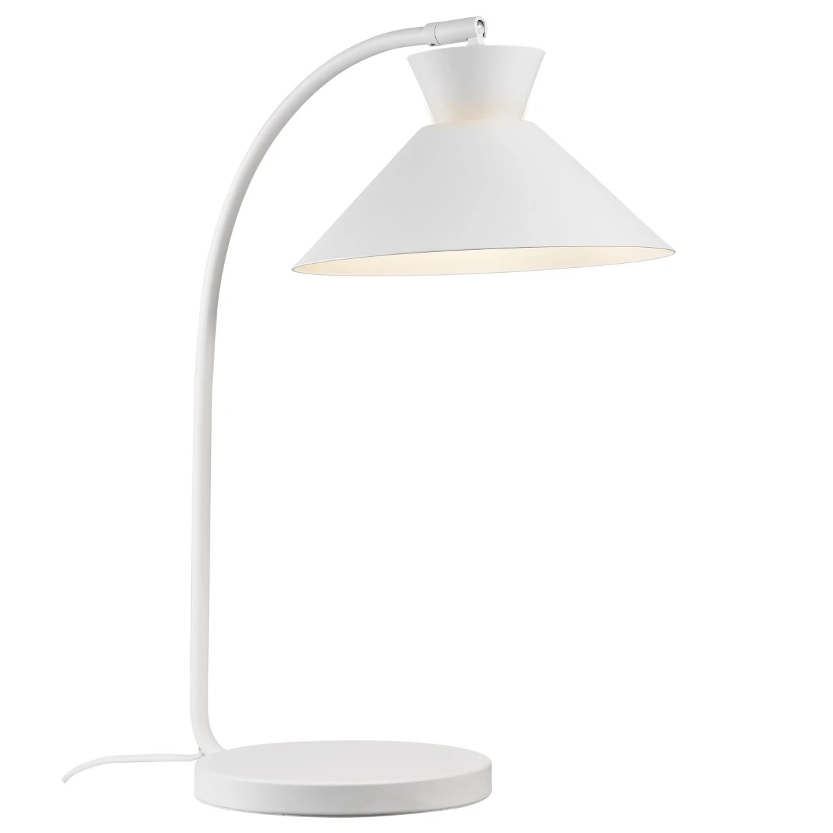 Die Dial Tischlampe aus weißem Metall hat ein luftig leichtes Design-Konzept. Der offene Schirm der Dial lässt aufgrund seiner geometrischen Form viel Licht durchscheinen und sorgt für einen dekorativen Uplight-Effekt. Folgend erhält die Tischleuchte den Anschein einer schwebenen Wirkung. Der gebogene Stab der Leuchte sorgt für einen sanften Ausdruck, wodurch dieser ebenso das Konzept der Leichtigkeit unterstützt.